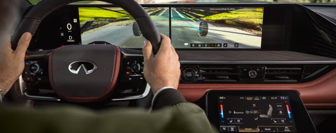 Step inside either SUV and you’ll find upscale materials and advanced features, but Infiniti takes interior design one step further with thoughtful details that feel crafted just for you. The QX80 comes with leather-appointed first- and second-row seats, 10-way power front seats with lumbar support, and TailorFit® third-row seating. It also features dual 14.3-inch displays and a dedicated 9-inch touchscreen for HVAC, Drive Mode settings, and Electronic Air Suspension controls.